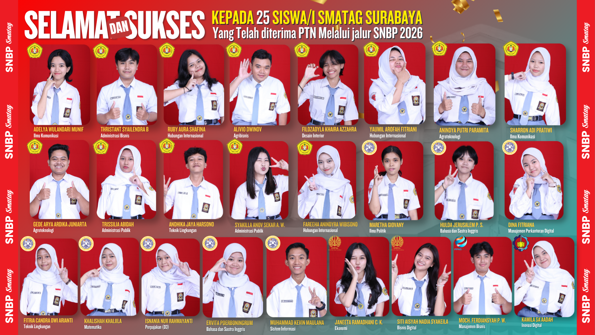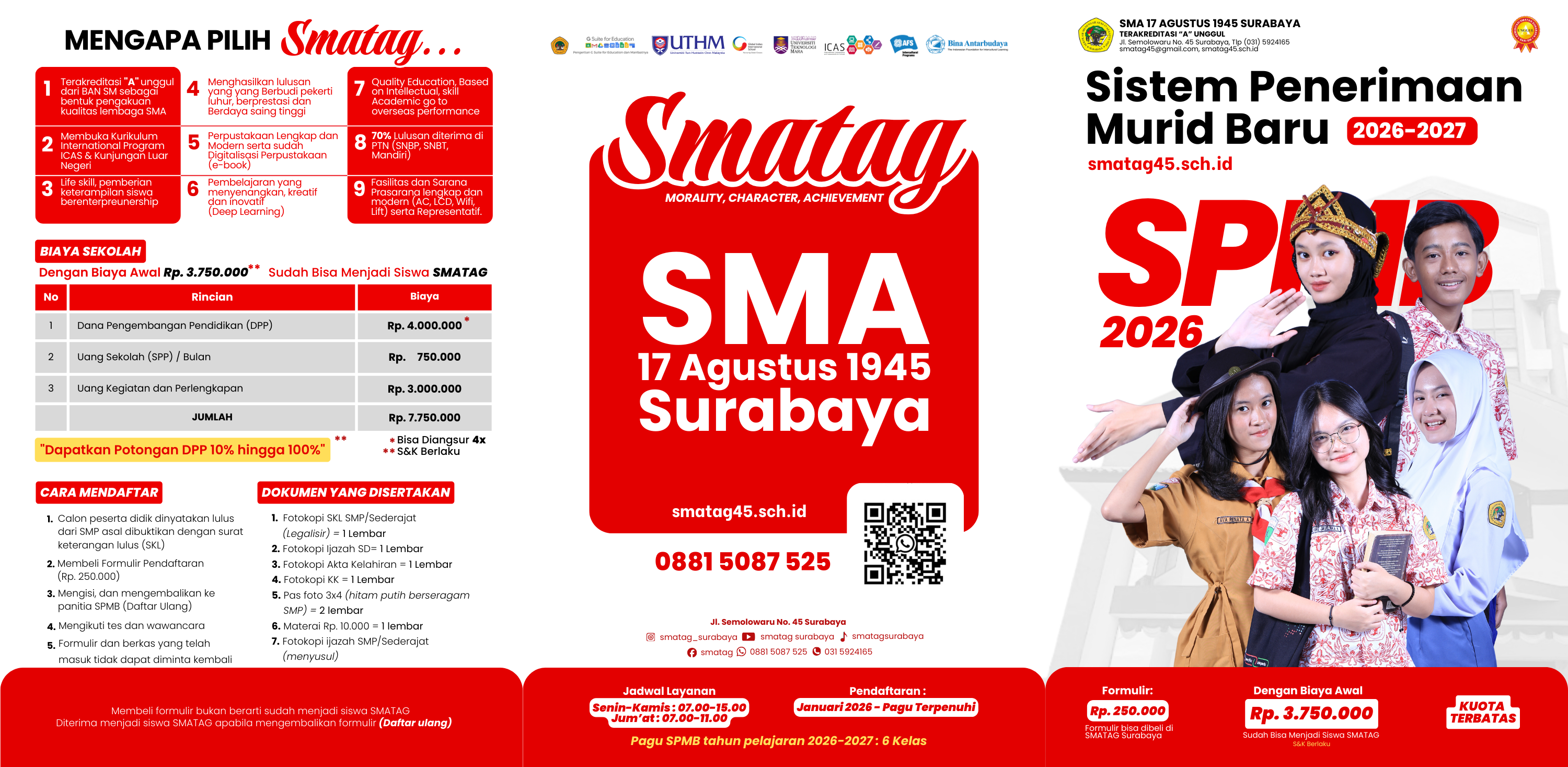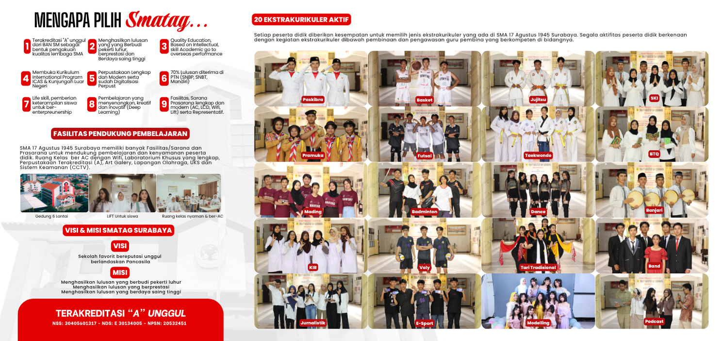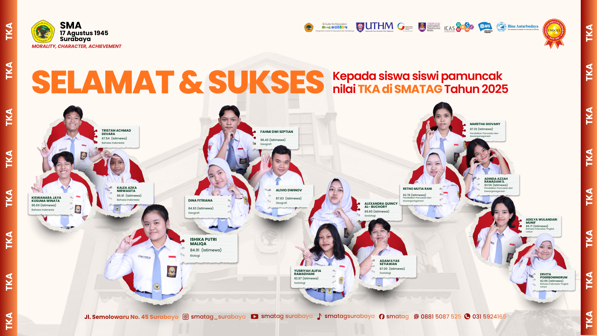 "SMATAG memang bisa dikatakan SMA favorit di surabaya karena fasilitas yg diberikan cukup lengkap, lingkungan nya bersih dan terawat, serta guru dan staff yg selalu memberikan support dan apresiasi, kegiatan sekolah yg memberikan wadah bagi para siswa dalam mengembangkan bakatnya didukung secara penuh oleh SMATAG. "